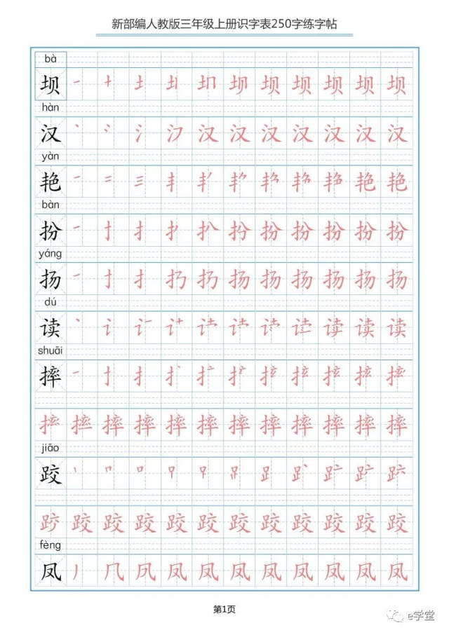 统编版三年级语文(上册)生字表笔顺练习