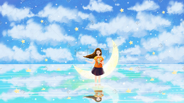 天空船月亮星星唯美治愈系风景插画图片