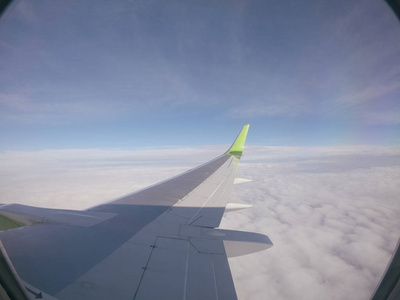 透过窗口飞机飞行中翼蓝色天空