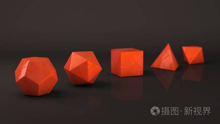 一套柏拉图式的固体, 橙色, 浮雕表面。多边