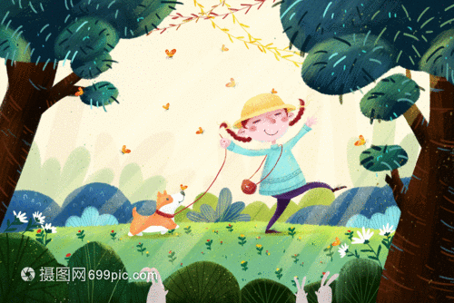 唯美清新绿色春季女孩运动跑步遛狗插画