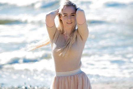 女孩。年轻的金发女子,微笑。时尚米色裙子