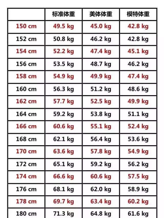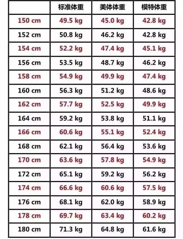 2018标准体重对照表,身高150-180cm的妹子请入座,也许你还挺瘦