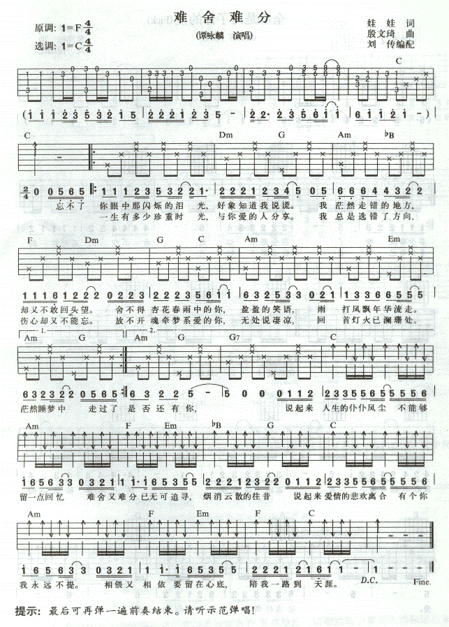 难舍难分吉他谱 C调 简单版 谭咏麟