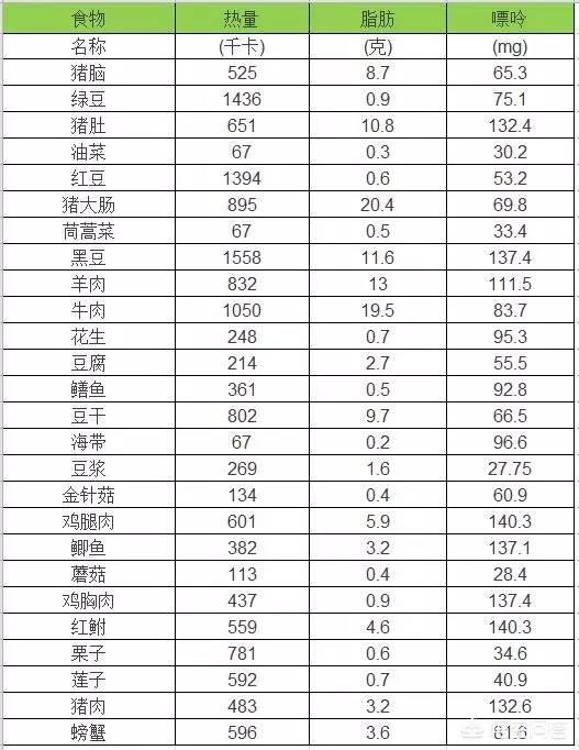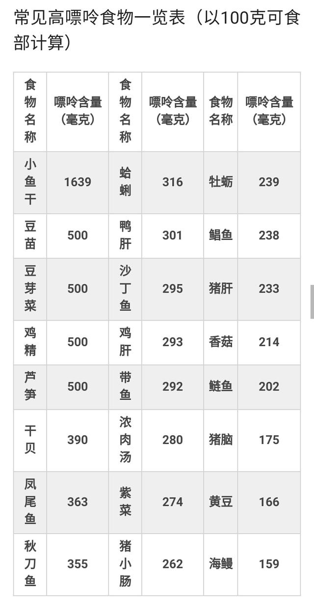 高嘌呤食物列表 完整的食物嘌呤含量表