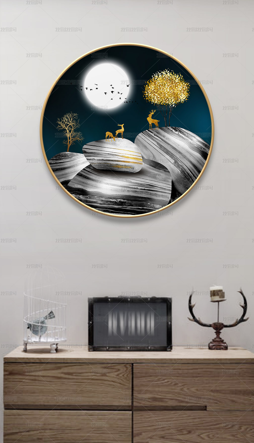 现代轻奢时来运转福鹿圆形装饰画