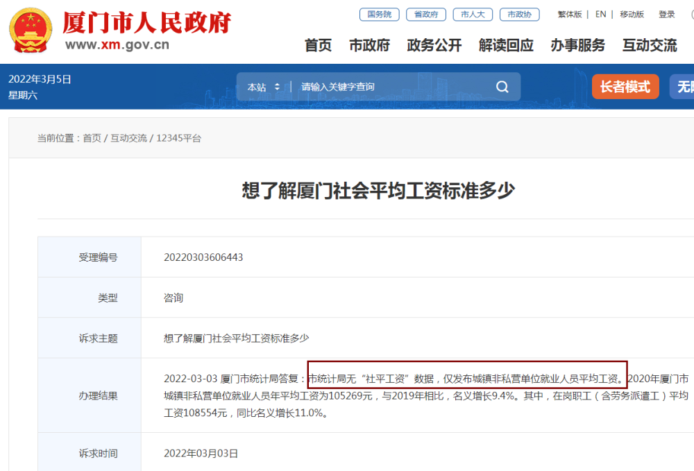 厦门社会平均工资标准是多少官方的回复