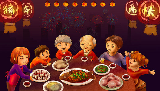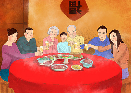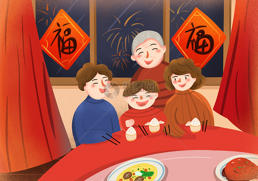 插画-三代同堂卡通-三代同堂手绘图片下载
