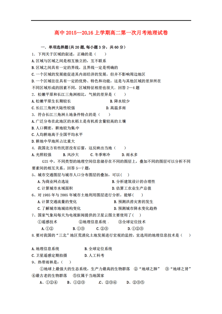 安徽省太和二职高2015-2016学年高二地理