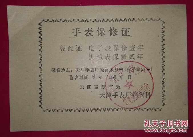 (天津手表厂)手表保修证