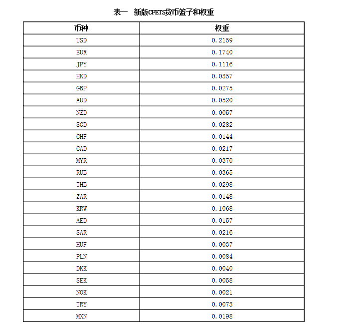 人民币汇率指数货币篮子权重调整:美元下降,欧