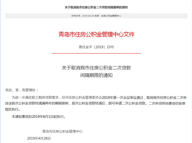 青岛拟取消公积金二次贷款间隔两年期限 6月1