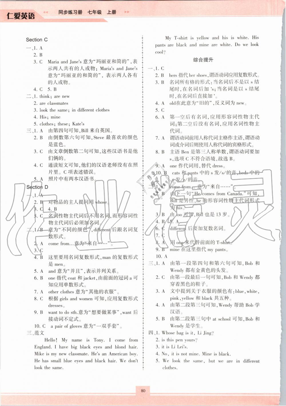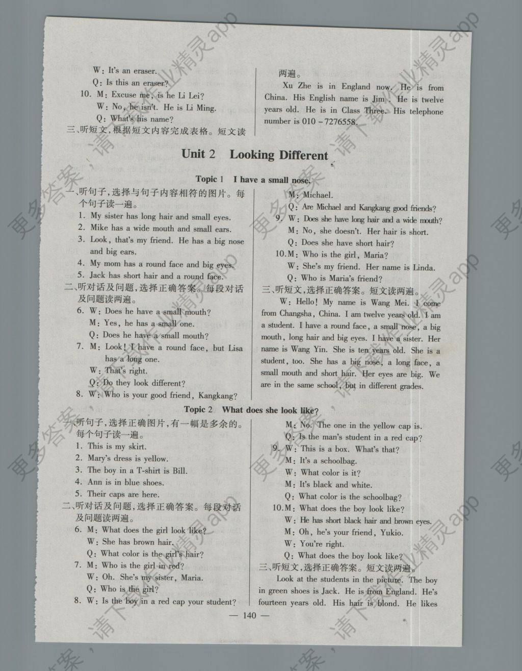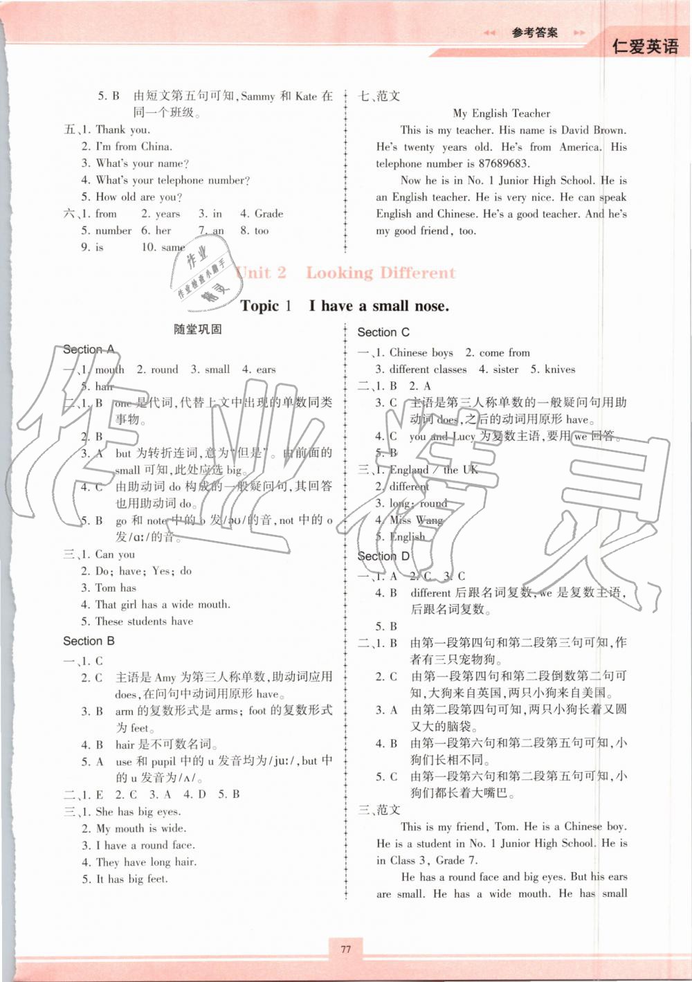 求仁爱英语七年级上册同步练习册Unit2 Topic1的答案- 答: Section A 一:1.wide 2.guess 3.ears 4.nose 二:BBAAC 三:1.have;have 2.has 3.have 4.has 四:1.can you 2.Do;have;yes;do 3.Tom has 4.That girl has a wide mouth 5.They ha