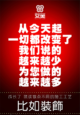 野狼装饰。4、源于执着奔放,释放美的根基。5、缤纷色彩,你我共享。6、相信我们,我们只求更好…7、鼎盛天成,您美 更多 装修公司广告宣传语集