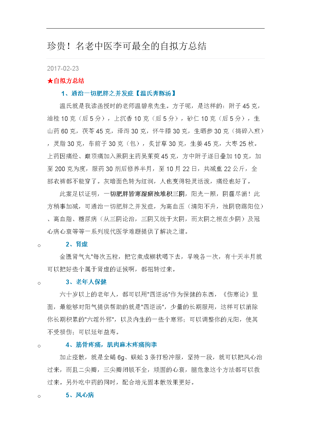 李可大医在《人体阳气与疾病--对话大医李可》一书中提到温氏奔豚汤对三阴阳虚、寒湿凝阻疾病很有效果,其中药方如下:附子45克(日叠加10克,最后至200克),油桂10克(后5分