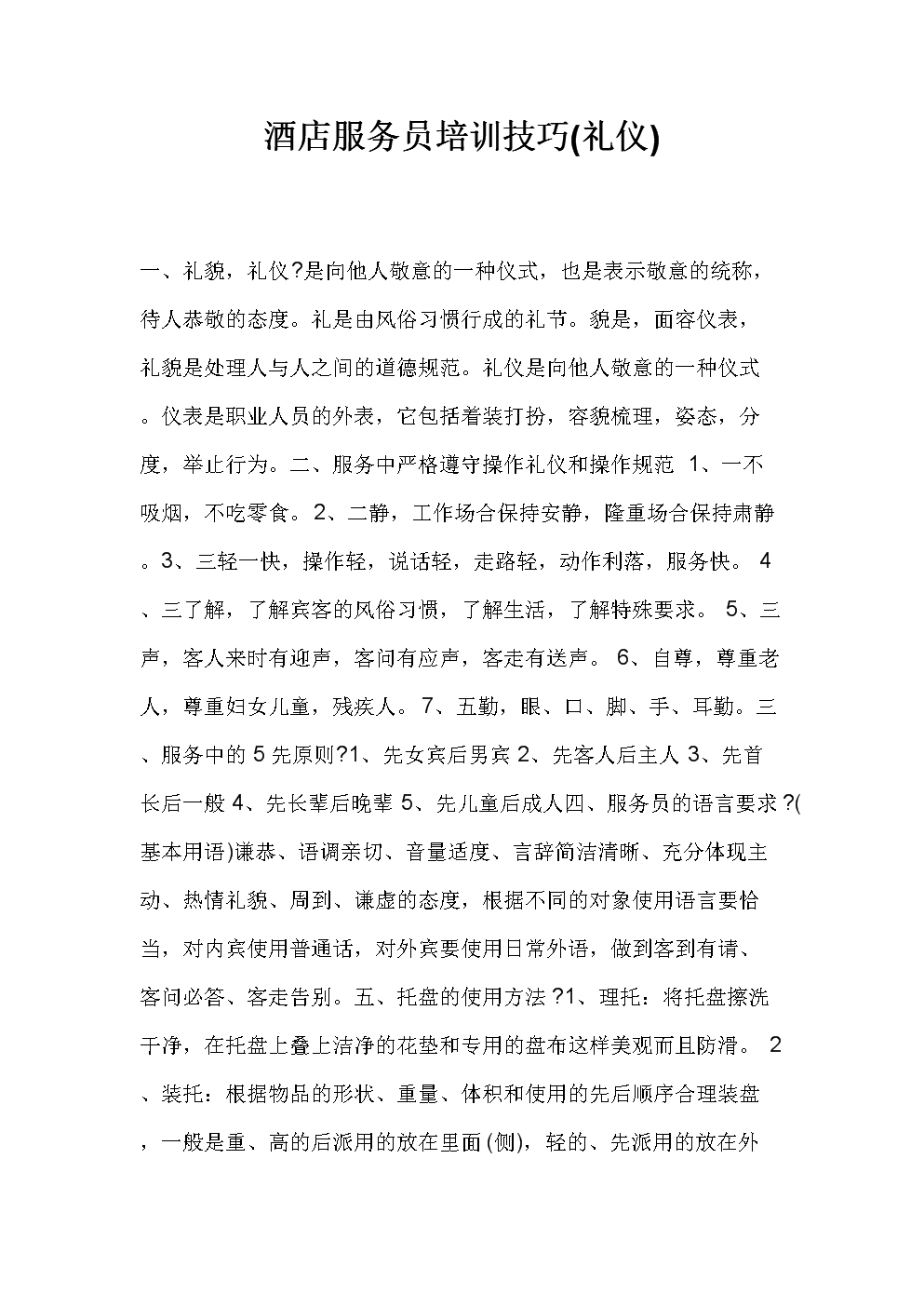 酒店服务员培训资料 一、服务员仪容仪表总体要求: 1、容貌端正,举止大方;端庄稳重,不卑不亢;态度和蔼,待人诚恳;服饰庄重,整洁挺括;打扮得体,淡妆素抹;训练有素,言行恰当。