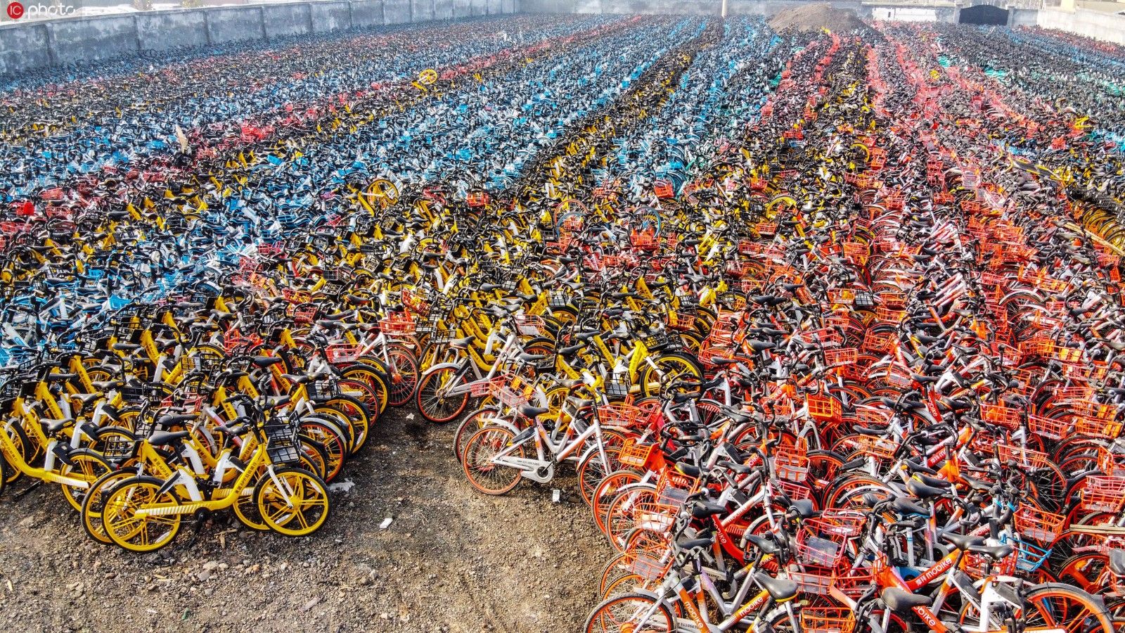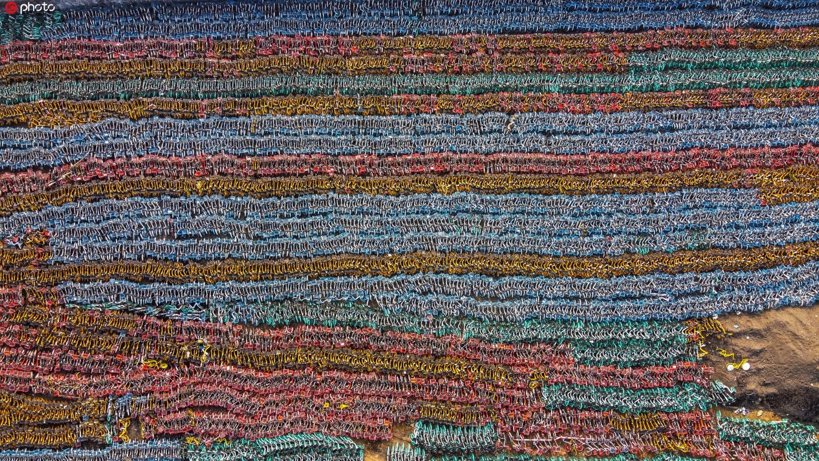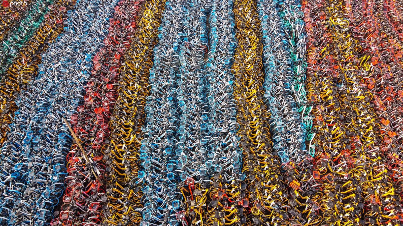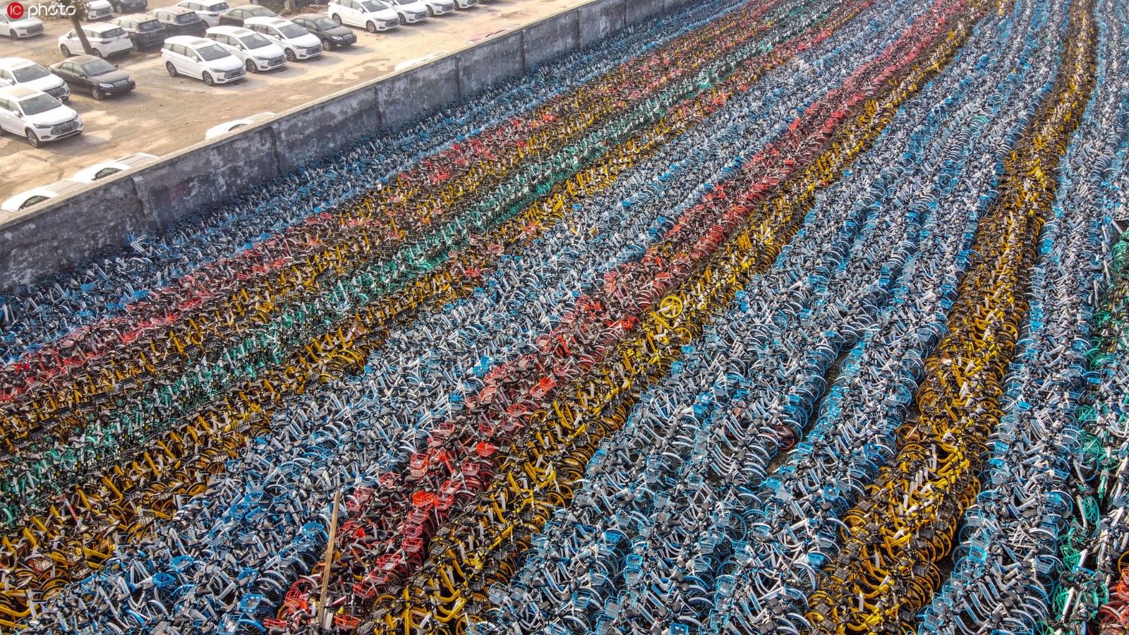2019年12月8日,山东省济南市礼霞区设立了自行车临时停车场。各种颜色的自行车整齐地停放在一起。超过5300平方米的停车场挤满了共享自行车。从高处看空它看起来像一个五彩缤纷的花田。据记者粗略统计,这个数字接近1万。(照片来源:东方集成电路)