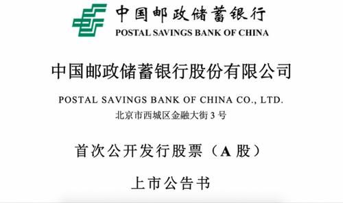 12月8日,邮政储蓄银行发布首次公开发行(a股)上市公告,显示其a股将于2019年12月10日在上海证券交易所上市。证券被称为“邮政储蓄银行”,证券代码为“601658”。