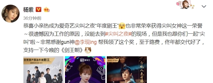 因为当杨紫发布内容时,他对李贤邦帮助自己赢得奖杯非常有礼貌,他还用剧中人物的名字给李习安打电话。此外,在表达内容时,杨紫也表现出了回馈的诚意,但在比较冷淡的一面,他说:“至于差旅费,童年已经做出了解释,支持今晚的剑朝。”