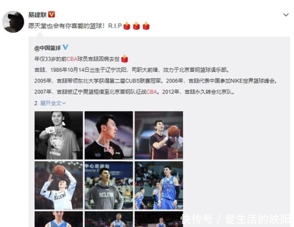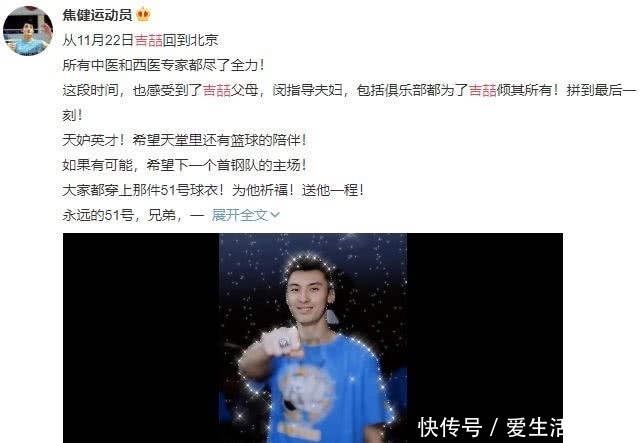 “从11月22日吉喆回到北京,所有的中西医专家都尽了最大努力!在这段时间里,我还觉得吉喆的父母,敏和他的妻子,包括俱乐部,为吉喆奉献了他们所有的一切。战斗到最后一刻!天堂羡慕杰出的人才!希望天堂里有篮球公司!如果可能,希望下一个首钢队的主场!每个人都穿上51号球衣!为他祈祷!载他一程!永远51岁,兄弟,祝你旅途愉快!”