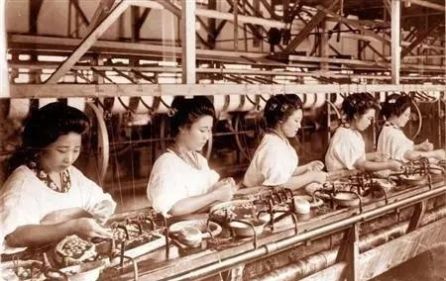 日本丝绸厂的女工经过十年的工业发展,日本的产业结构发生了巨大的变化。战前,日本工业由纺织业等轻工业主导。战后,机械、冶金、造船、化学、纺织、航运、矿业等行业形成了全面发展格局。这样,日本在工业化道路上迈出了最坚实的一步。