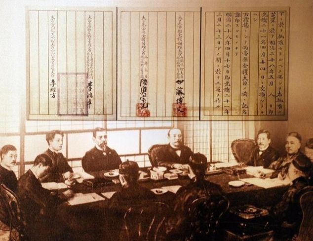 《马关条约》签署现场在我们讨论《马关条约》如何改变日本之前,让我们先计算一下日本在1894年中日战争中“赚了多少钱”。