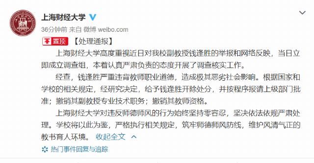 上海财经大学9日晚报道称,上海财经大学非常重视近期对我校副教授钱盛丰的报道和网上回复。同一天,立即成立了一个调查小组,以认真负责的方式进行调查和核实。经过调查,钱盛丰严重违反了教师职业道德,造成了极其恶劣的社会影响。根据国家和学校的有关规定,钱盛丰经研究决定后将被开除,并将按程序报请上级批准。撤销副教授的专业技术职务;撤销他的教师资格。