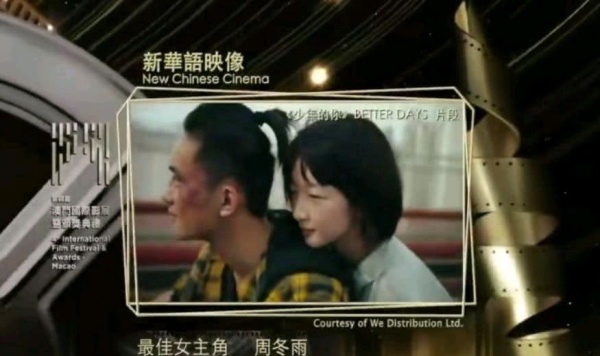 周冬雨因在《年轻的你》中扮演陈年而获得新中国形象最佳女主角,并在众多竞争对手中获得澳门最佳女主角。