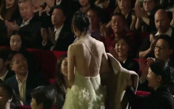当她上台领奖时,她站起来脱下大衣。她转过身来,露出白色的后背,恢复了美丽的状态。