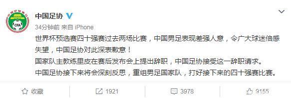 国家足球队以1比2输给了叙利亚,国家队教练里皮在赛后新闻发布会上提出辞职。中国足协也首先发布公告,接受里皮的辞职请求。与此同时,中国足协还表示,将对下一步进行深入思考,重组男子国家队,让其继续参加前40名的剩余比赛。