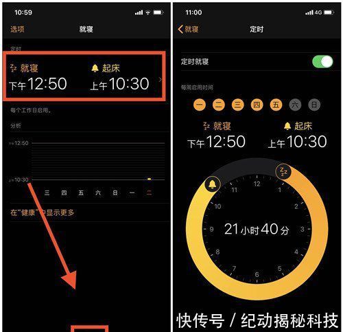 设置完以上两个步骤后,我们点击“时钟”应用程序,找到“就寝时间”模式,打开它,然后设置我们的就寝时间和起床时间。