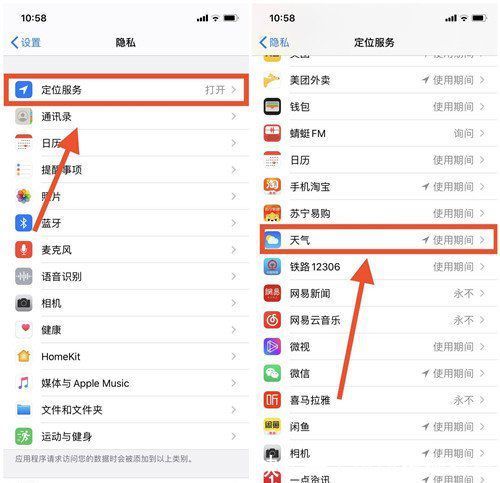 设置“请勿打扰”模式后,我们还需要设置“天气”的位置许可来显示本地天气。我们的线路会打开“设置”。然后找到“隐私”,点击“定位服务”,将“天气”权限设置为“使用期”。