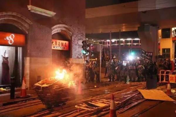 下午7点,警察小组准备清理院子,并提醒楼上的居民关上窗户。一些示威者用他们的金属爬杆敲街道商店紧闭的铁门。一些人发出奇怪的声音,一些人开始向警察扔垃圾。在多次升旗警告失败后,警方果断地发射了催泪瓦斯。仍在喊叫的激进示威者在一瞬间逃跑了。示威者丢弃的砖块、钢管和其他致命武器随处可见。晚上,警方还宣布示威者在上环许多地方放火,“示威者使用的暴力正在升级。”