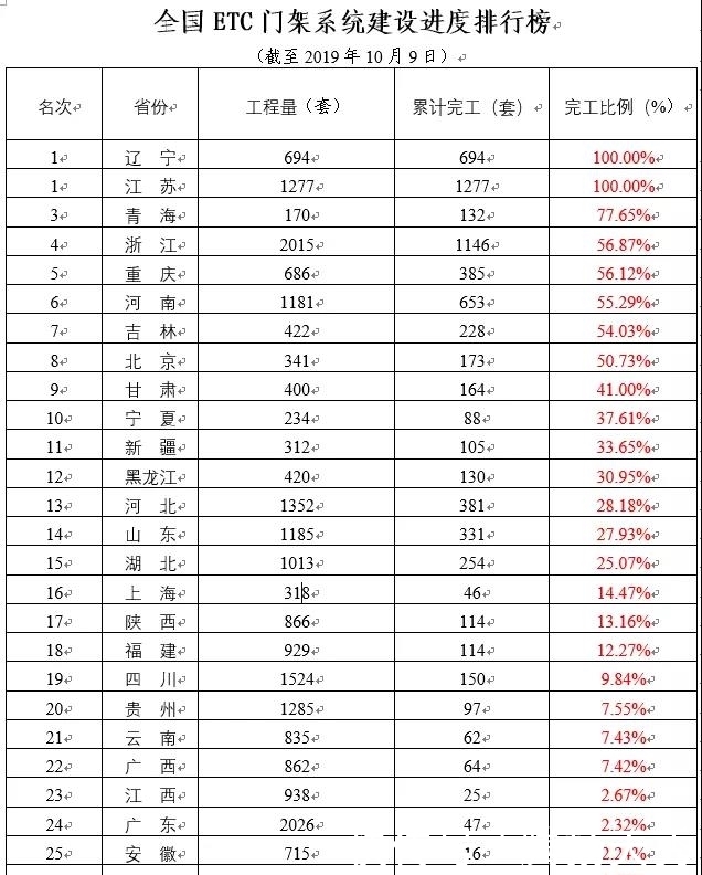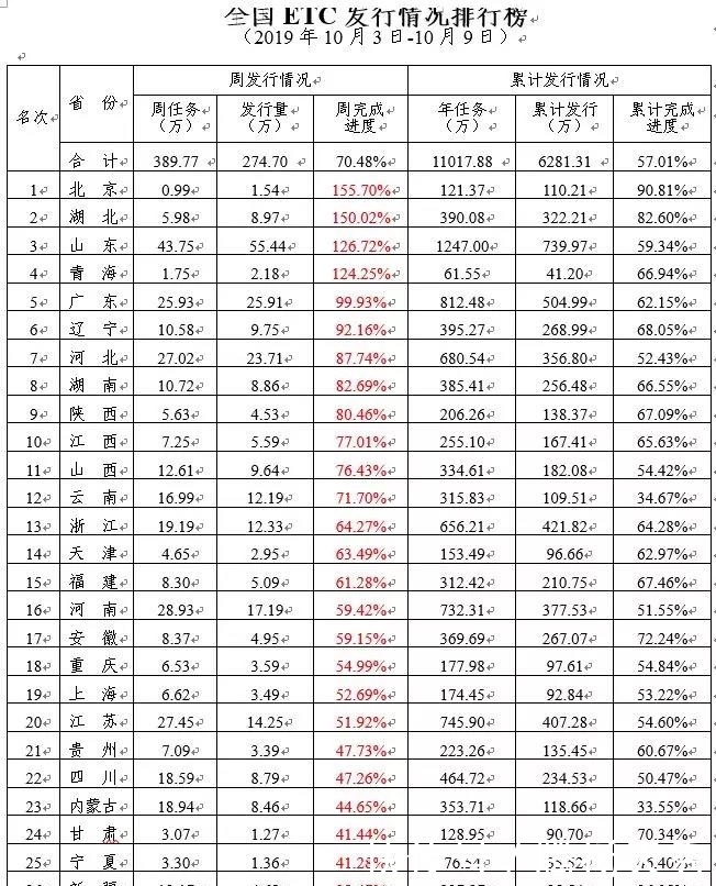 注:1 .全国电子商务配送任务总数为1.908556亿,其中今年新增1.10178亿。为了准确反映今年各地区的分配情况,从本周开始,将根据5月15日后实际流通与新增分配任务的比例进行排序和通知。第二,鉴于ETC门户系统的建设和ETC车道的重建,从本周开始,将根据完成进度进行排名和通知。