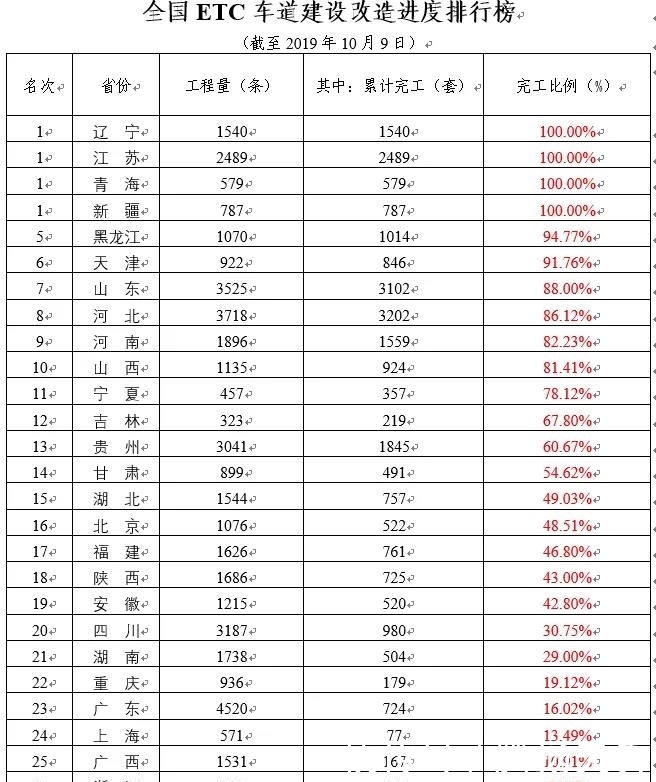全国共建设和改造了49393条电子收费车道。截至10月9日,已完成项目25,201个,占总计划的51%。其中,完成率最高的省份是辽宁(100%)、江苏(100%)、青海(100%)、新疆(100%)、黑龙江(94.8%)、天津(91.8%)、山东(88%)、河北(86.1%)、河南(82.2%)和山西(81.4%);接下来的10个省是内蒙古(0%)、江西(2.1%)、云南(6.5%)、浙江(8%)、广西(10.9%)、上海(13.5%)、广东(16%)、重庆(19.1%)、湖南(29%)和四川(30.8%)。