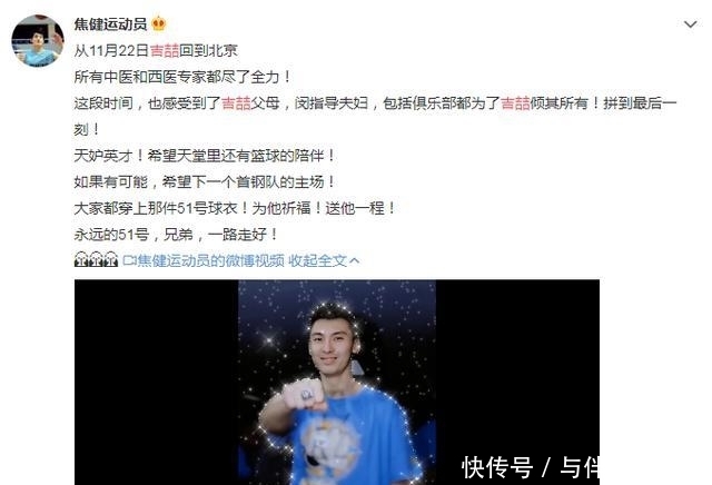 今天早上7点52分,前北京男篮明星焦健第一个在微博上宣布了这个不幸的消息。焦健写道:从11月22日吉喆回到北京,所有的中医和西医专家都尽了最大努力。在此期间,我也感觉到吉喆的父母,闵和他的妻子,包括俱乐部,在最后一刻都为吉喆付出了一切。