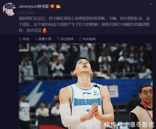 林书豪说:“虽然我们以前没见过你,但我们感觉你今晚在球场上。今晚,你对我的队友、这支球队、这座城市和这个国家都有很大的影响!我很高兴我们今晚能为你赢得比赛,去吉喆。”