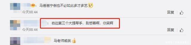 一个大提琴手在马云的指挥下忍不住笑了起来。即使视频模糊不清,也能看到他的笑脸。看到这一幕后,网民们忍不住笑了起来:“右边的第三个大提琴手,不要退缩!你笑!”