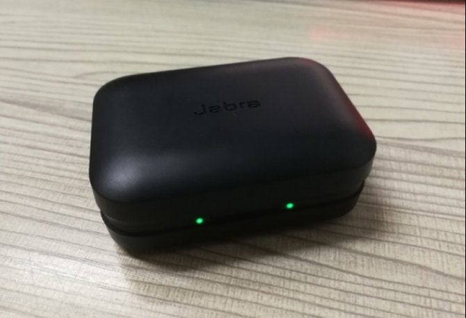 贾布拉精英运动蓝牙耳机是为戴在耳朵里而设计的。耳机和充电盒都是黑色的。充电箱外还有两个指示灯,用于电源指示。