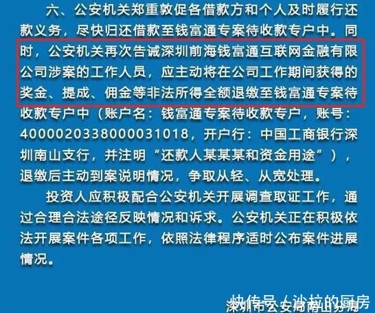 深圳市公共南山支行督促所有借款人和个人及时履行还款义务,尽快将贷款归还至钱福通项目专用账户催收。与此同时,公安机关再次敦促涉案钱福通的工作人员自愿将公司工作期间获得的奖金、佣金、佣金等非法收入全额退还给钱福通项目收款专用账户,并在追回后主动到庭解释情况,以获得从轻发落的待遇。