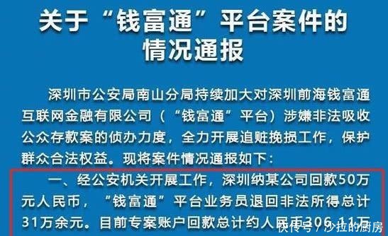 其中,钱福通涉嫌非法吸收公众存款。通过公安机关的工作,深圳的一家公司收缴了50万元,钱福通平台的员工共返还了31万元以上的非法收入。目前,专项资金账户共收资金306.11万元。