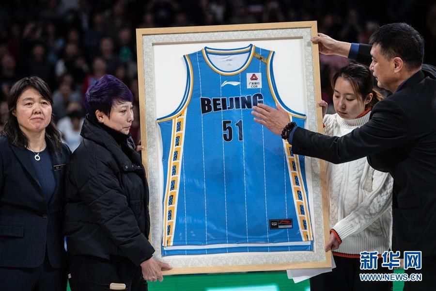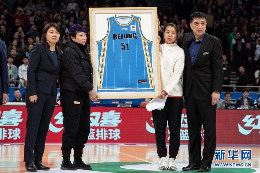 12月10日,首钢前主教练闵路雷(右一)身穿吉喆球衣。当天,在2019-2020赛季中国男篮协会(CBA)第15轮常规赛中,北京首钢为吉喆球衣举行了退役仪式。新华社记者吴壮拍摄\r