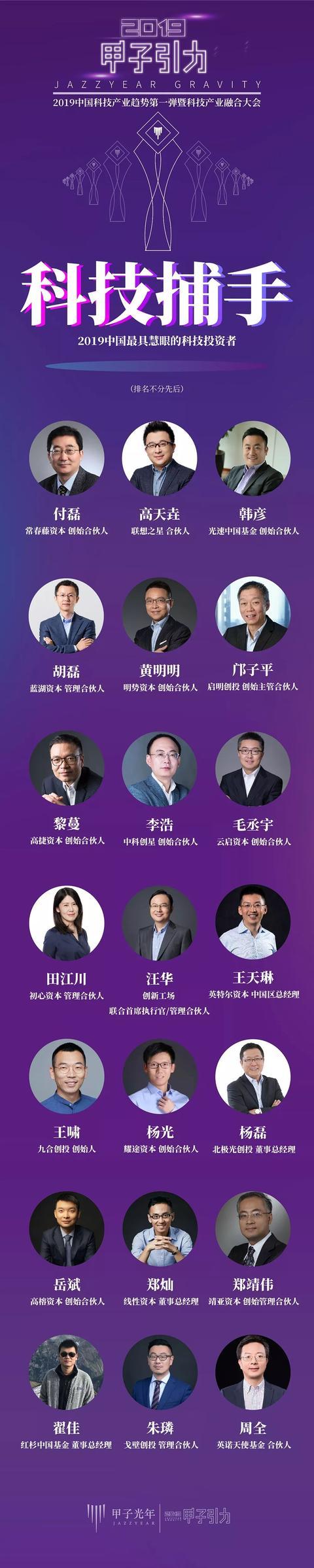 傅雷(常青藤联盟资本)、高天耀(联想之星)、闫涵(光速中国)、雷虎(蓝湖资本)、黄明明(史明资本)、邝子平(祁鸣风险投资)、李曼(高捷资本)、李浩(中科创星)、毛承宇(云起资本)、田江川(楚信资本)、汪华(创新工程)、王天林(英特尔资本)、王晓(九河风险投资)、杨光(尧都资本)、杨磊(北极光风险投资)、岳斌(高荣资本)、翟佳(红杉中国基金)、郑灿(线性资本)、郑铮