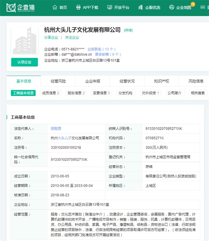 根据公司业务信息,杭州达图森文化发展有限公司成立于2013年6月5日,法定代表人为邵盛楠。
