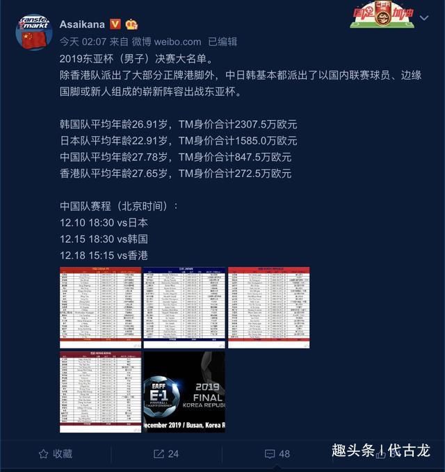 北京时间12月9日,离亚东杯比赛开幕只有一天了。10日,中国队将迎来他们的第一个对手日本,预计他们能否给出胜利的答案。目前,参加比赛的四支队伍都已确定了一个大名单。从德国到朱毅的统计数据显示,四支球队的年龄结构和社会价值也已经公布。