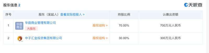 股东信息:华庭商业管理有限公司70%;中子汇金投资集团有限公司30%