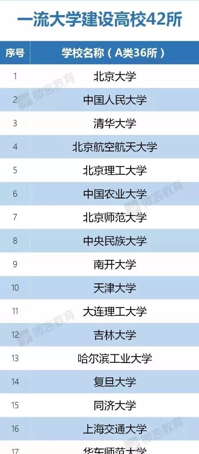 “双一等”是两个平行的评估系统。“建设一流大学”重点是以一流学科为基础的学校整体建设和重点建设,全面提高人才培养和创新能力水平,共有42所,原有39 985所大学新增3所。