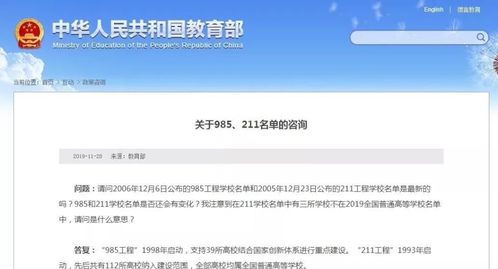 截图来自教育部网站:2006年12月6日公布的985所项目学校名单和2005年12月23日公布的211所项目学校名单是最新的吗?985和211学校的名单会有什么变化吗?我注意到211学校名单中有三所学校不在2019年全国普通高校名单中。什么意思?