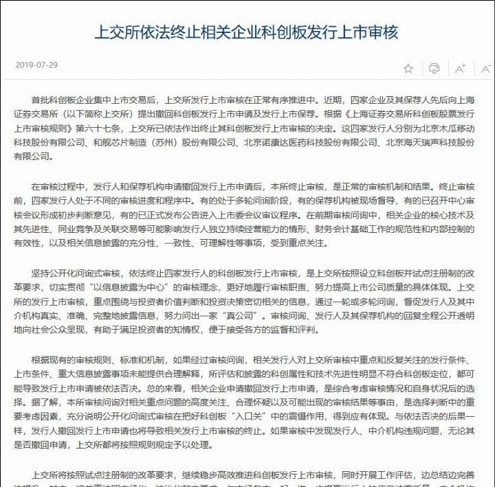上海证券交易所指出,根据《上海证券交易所科技股发行上市审批规则》第六十七条,上海证券交易所已依法决定终止科技股发行上市审批。然而,正常的审查机制和结果是,上海证券交易所将终止审查,以回应四家发行人及其保荐人,即木瓜移动、河间芯片、诺康达和海地盛瑞撤回上市申请。