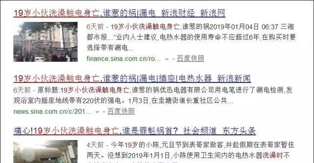 2019年初,一名19岁的男孩用电热水器洗澡,触电身亡。